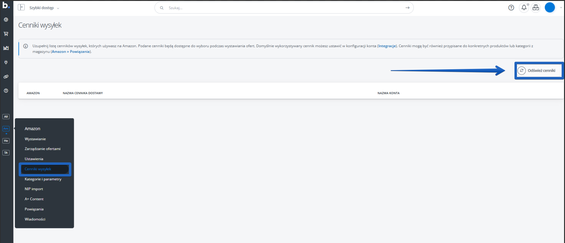 Aby wystawiać oferty na Amazon, konieczne jest pobranie do systemu informacji o cennikach wysyłek utworzonych uprzednio bezpośrednio po stronie marketplace'u. Cenniki te możesz powiązać np. z wybraną kategorią w sklepie, czy z konkretnymi produktami, dzięki czemu cennik w ofercie zostanie automatycznie wybrany podczas wystawiania.