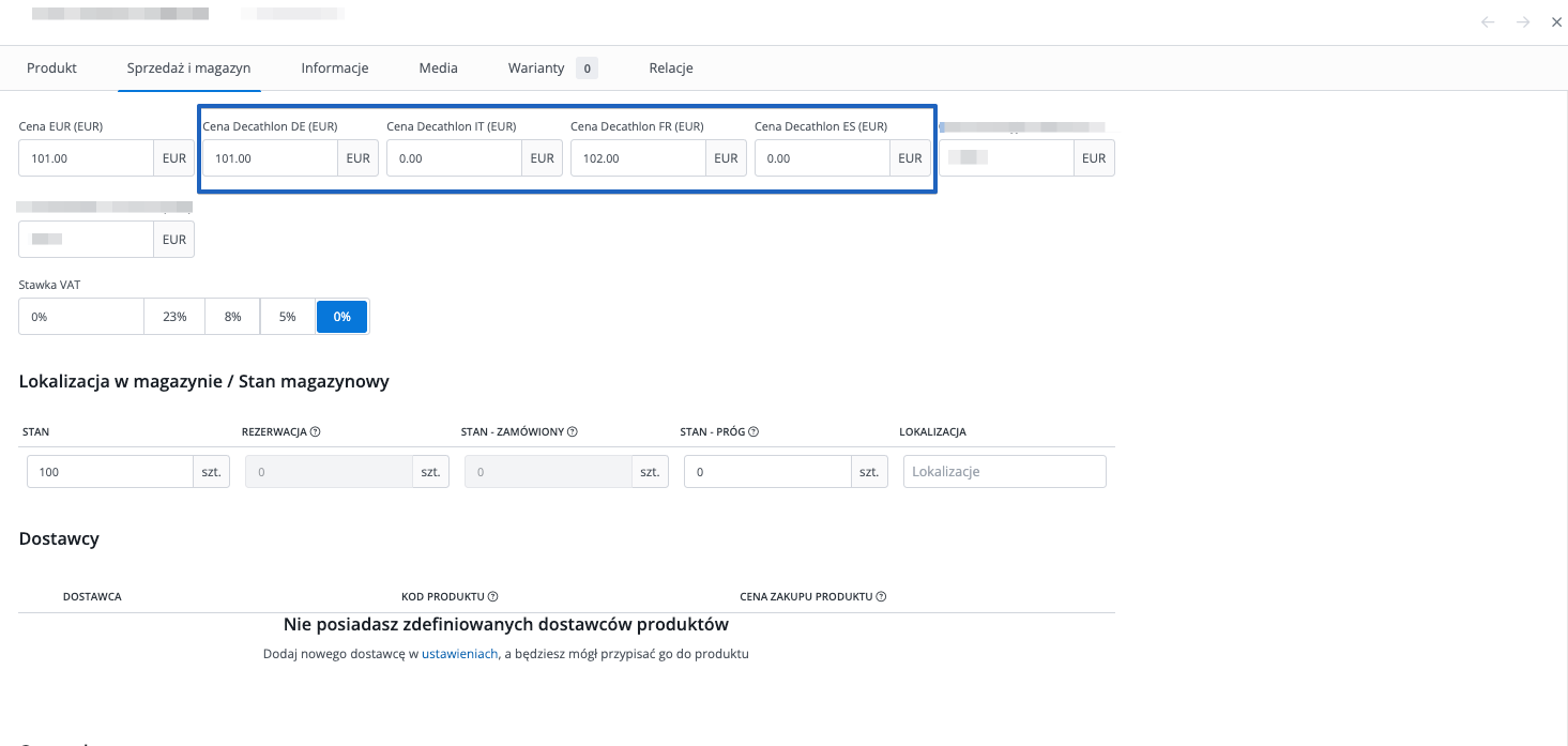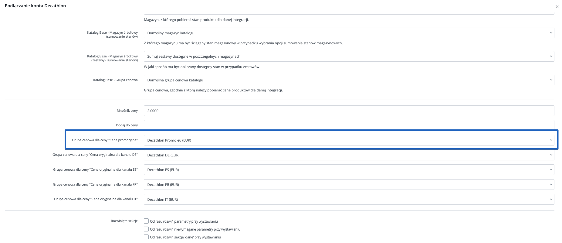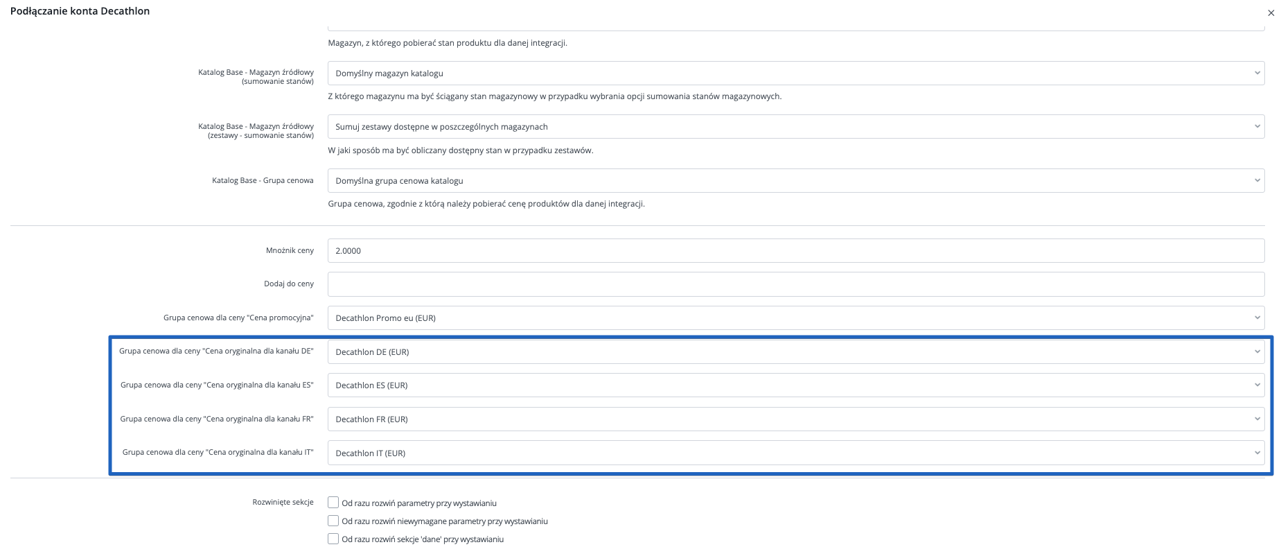 Poniższa instrukcja krok po kroku opisuje, jak skonfigurować przesyłanie różnych cen domyślnych dla każdego zintegrowanego rynku (kanału) dla Decathlon.