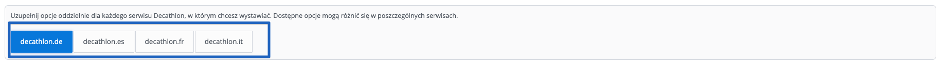 - Ustawienia grup cenowych należy przypisać dla każdego aktywnego rynku w ustawieniach integracji. Powyżej widzimy konfigurację dla zakładki decathlon.de Jeżeli chcemy aby wysyłane były ceny na rynek FR oraz IT musimy zrobić taką samą konfigurację na każdej z zakładek.