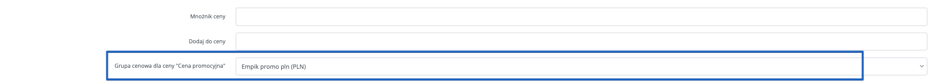 - Aby synchronizować cenę promocyjną na marketplace Empik, na początku stwórz nową gupę cenową, w której będziesz przechowywał ceny promocyjne. Po utworzeniu i powiązaniu grupy cenowej z katalogiem na karcie produktu, zobaczysz utworzoną grupę cenową.