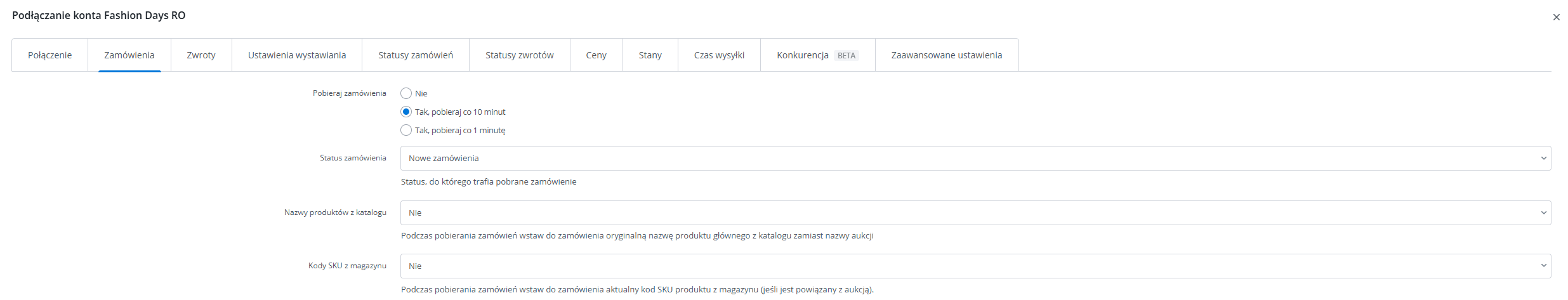 - Zamówienia – tutaj możesz włączyć pobieranie zamówień. Zalecamy jednak wcześniej odpowiednio skonfigurować Manager Zamówień;
