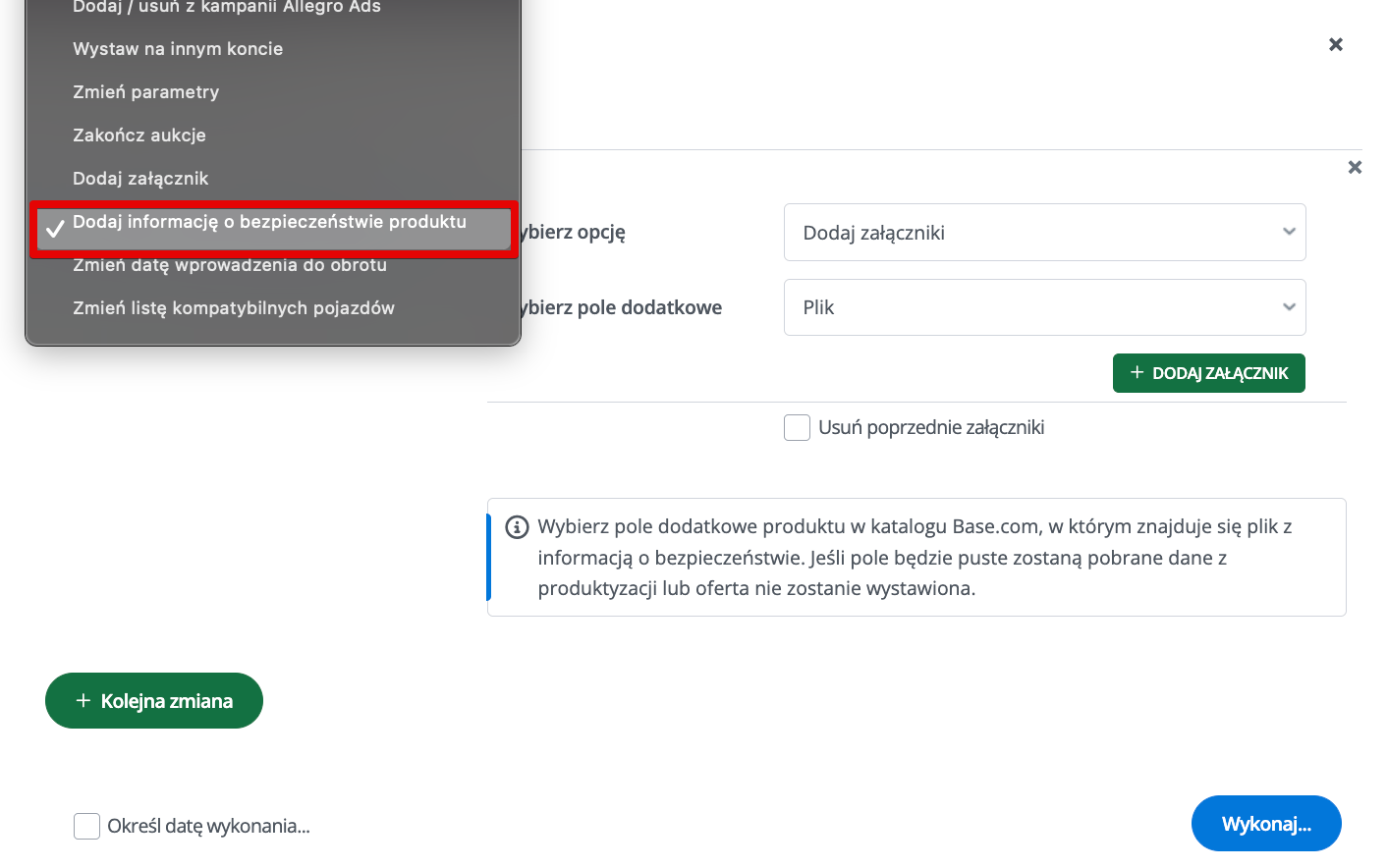 Za pomocą Base.com możesz również w szybki sposób zaktualizować osobę odpowiedzialną oraz producenta odpowiedzialnego w istniejących już ofertach Allegro.