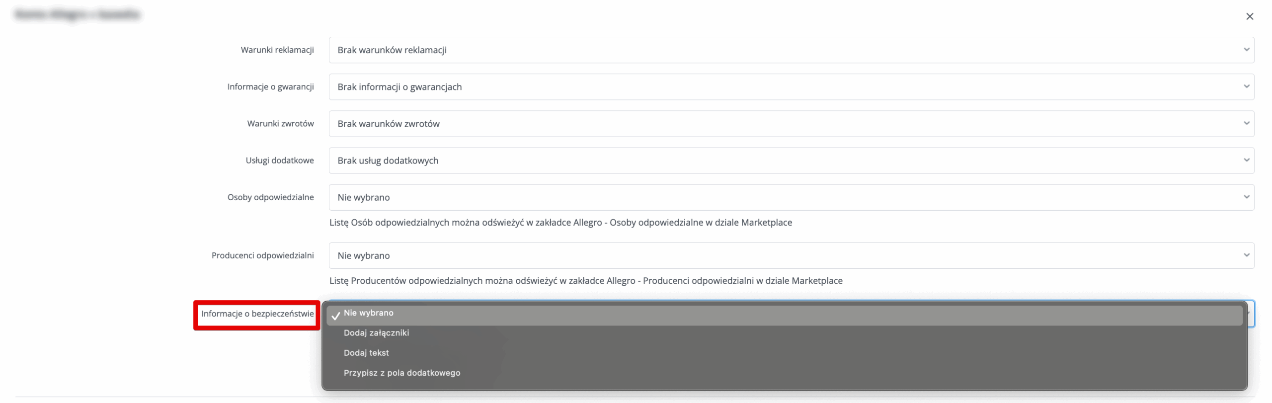 W integracji konta Allegro w zakładce Ustawienia aukcji możesz przypisać informację o bezpieczeństwie domyślnie dla całego konta w formie tekstu (opcja Dodaj tekst) lub wskazać pole dodatkowe, z którego ma być pobierana informacja o bezpieczeństwie w formie załącznika (opcja Dodaj załączniki) lub również w formie tekstu indywidualnie dla każdego produktu (opcja Przypisz z pola dodatkowego).