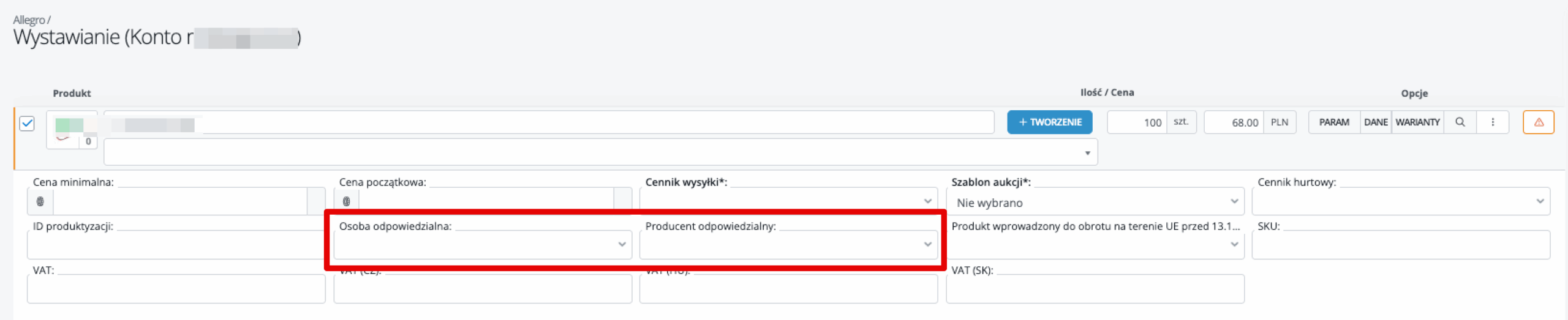 Osobę odpowiedzialną oraz producenta odpowiedzialnego możesz również wybrać ręcznie (po wcześniejszym utworzeniu po stronie Allegro i zaimportowaniu do Base.com) na formularzu wystawiania.
