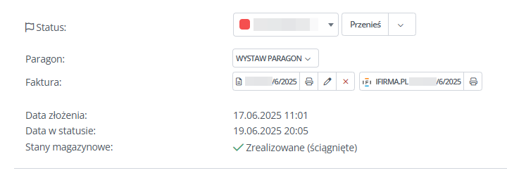 - Po wystawieniu faktury w Base.com i przekazaniu jej do iFirmy, na karcie zamówienia pojawia się przycisk do otwarcia pliku PDF z fakturą z iFirmy.
