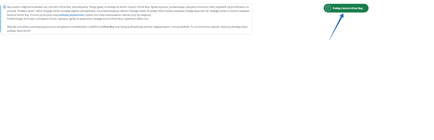 Aby system mógł komunikować się z kontem InPost Buy, potrzebujemy Twojej zgody na dostęp do konta i danych InPost Buy. Zgodę wyrazisz, potwierdzając specjalny formularz, który wyświetli się po kliknięciu przycisku "Podłącz konto".