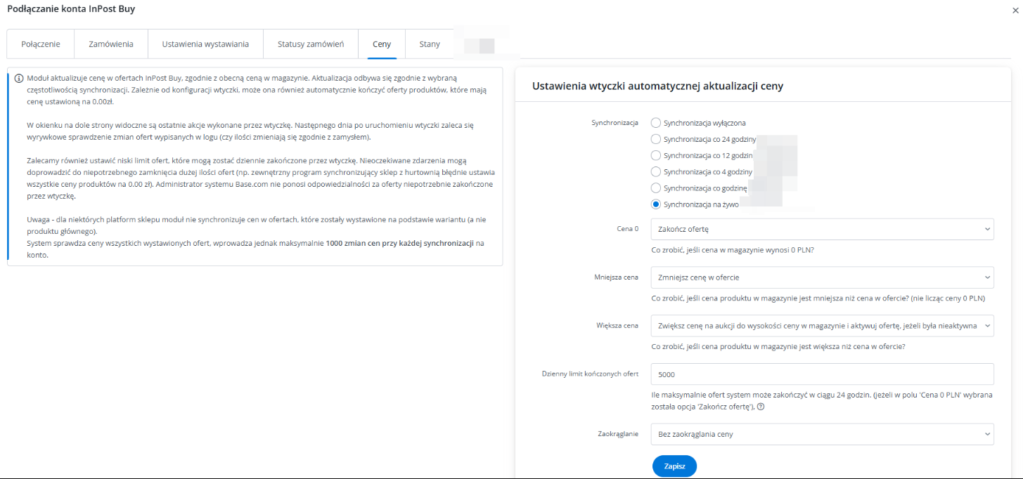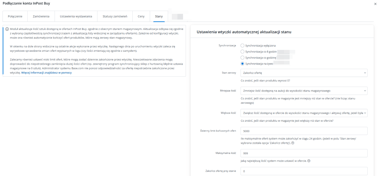 W zależności od potrzeb, aby w pełni korzystać z możliwości systemu, skonfiguruj moduł synchronizacji stanów i/lub cen w dziale Integracje → InPost Buy → Ceny/Stany.