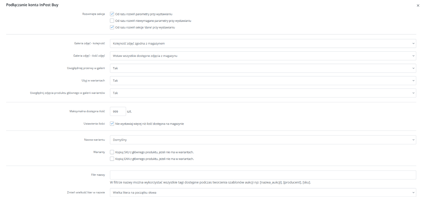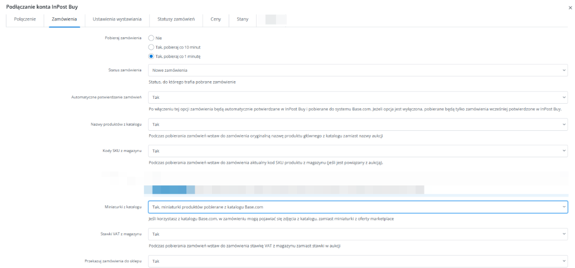 W tym miejscu ustawisz też status, jaki otrzymają pobrane zamówienia w systemie, włączysz ich przekazywanie do Twojego sklepu internetowego (jeśli masz podpięty), a także wybierzesz, czy produkty w zamówieniach mają mieć nazwę pobraną z marketplace InPost Buy czy z magazynu.