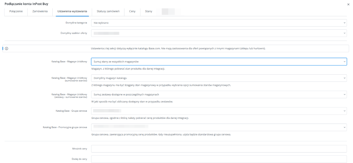 - Ustawienia wystawiania – w tej zakładce możesz wybrać domyślną kategorię, cennik czy szablon oraz inne opcje wystawiania produktów dla całego konta InPost Buy, a także ustawić mnożnik ceny;