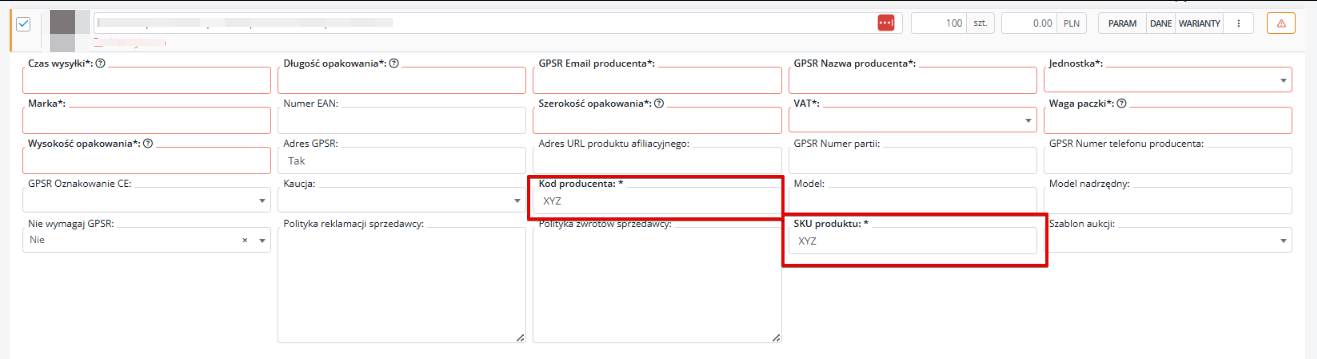 Na formularzu wystawiania należy uzupełnić kod producenta oraz sku produktu, dzięki czemu parameter “Numer EAN” nie będzie wymagany.