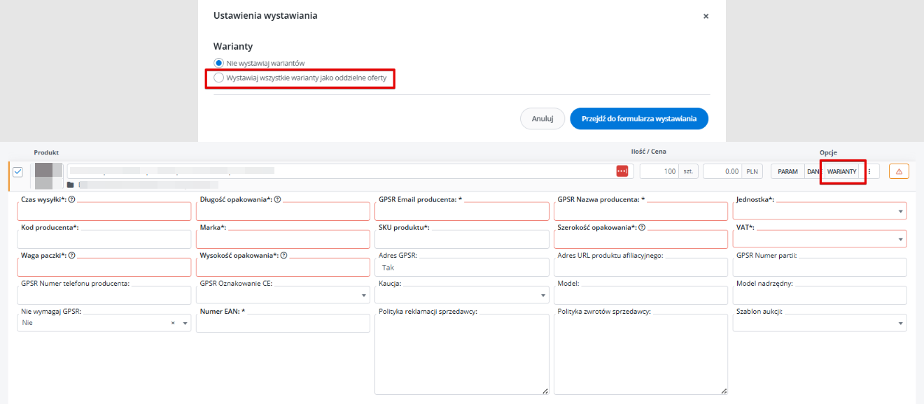 Na marketplace InPost Buy możliwe jest wystawienie produktów wariantowych jako oddzielne oferty. Opcję tę możesz zaznaczyć na liście ofert przed przejściem do formularza wystawiania lub na formularzu klikając przycisk “Warianty”