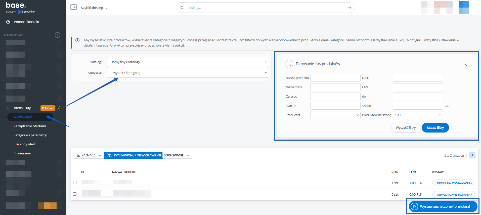 - Wystawianie – z tego miejsca możesz wystawiać produkty na marketplace. Aby przejść do formularza wystawiania, wybierz magazyn oraz kategorie, z których chcesz wystawić oferty, zaznacz produkty i kliknij Wystaw zaznaczone (formularz).