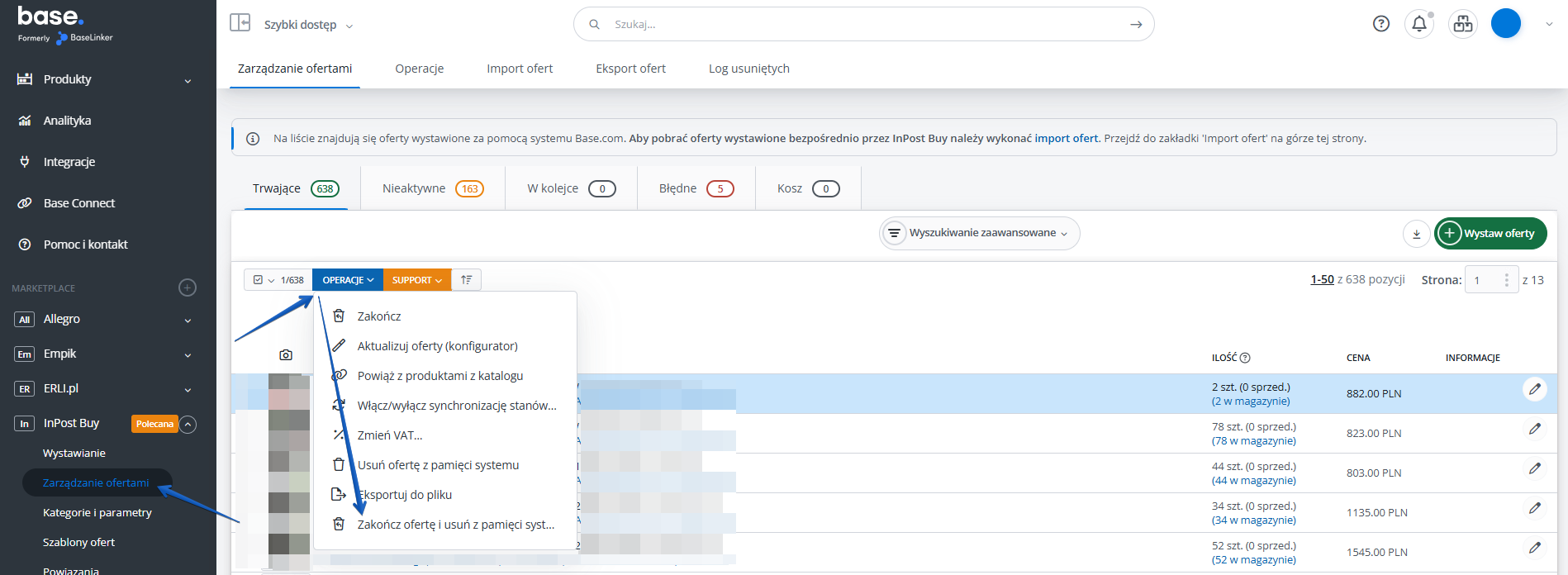 Jeżeli chcesz usunąć ofertę z marketplace InPost Buy w zarządzaniu ofertami, zaznacz ofertę, którą chcesz usunąć i z menu operacje wybierz opcję “Zakończ ofertę i usuń z pamięci systemu”