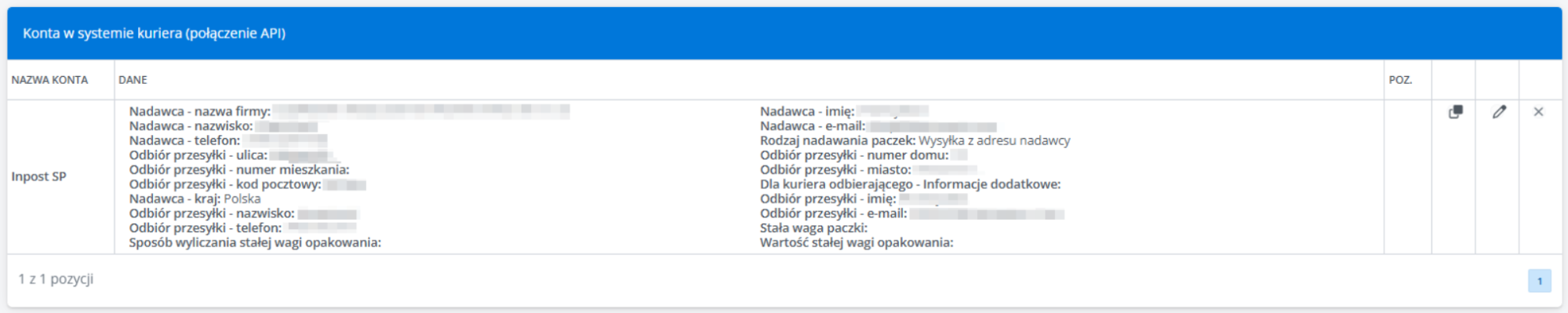 W tym miejscu dostępna jest lista wszystkich podpiętych do systemu kont kuriera. Jeśli posiadasz ich więcej niż jedno, możesz zmieniać ich pozycje za pomocą strzałek z prawej strony tabeli. Możliwe jest również klonowanie, edycja oraz usunięcie każdego z kont. W oknie edycji dostępne są wszystkie pola, które dostępne były podczas podłączania integracji.