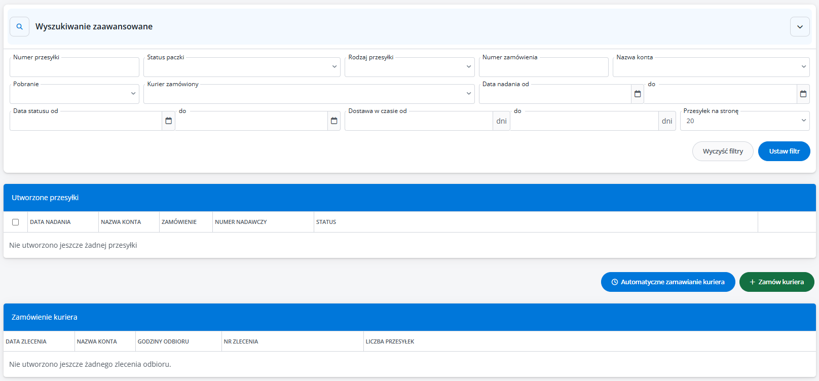 W tym miejscu dostępna jest lista wszystkich nadanych przesyłek za pomocą integracji InPost International. Do każdej z nich możesz pobrać etykietę, sprawdzić status oraz zamówić kuriera. Powyżej tabeli dostępne jest Wyszukiwanie zaawansowane, gdzie wyfiltrujesz wybrane paczki.