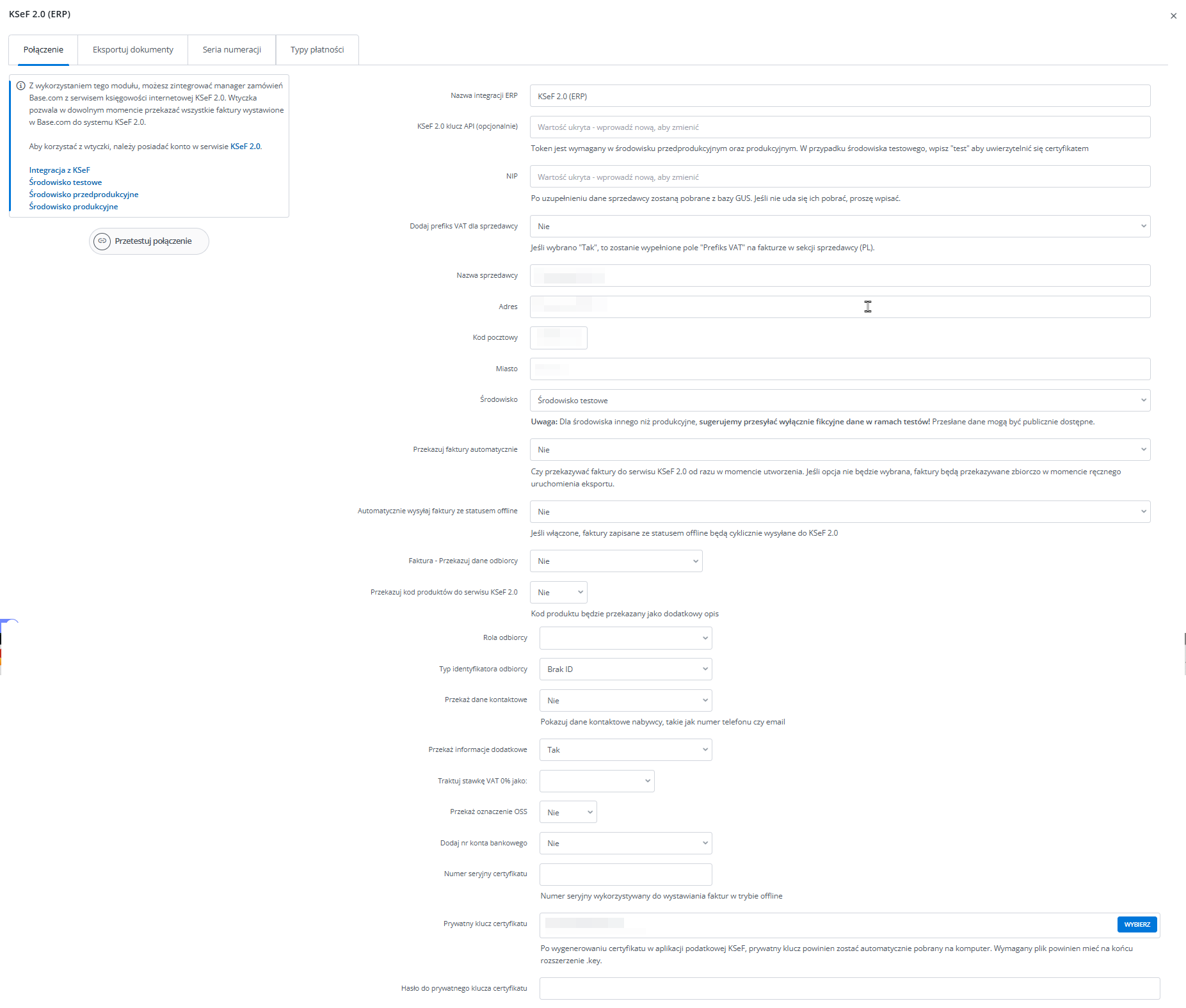- Prywatny klucz certyfikatu – plik niezbędny do autoryzacji dokumentów wystawianych poza połączeniem z serwerem MF. Podczas generowania certyfikatu w aplikacji podatkowej KSeF, klucz prywatny powinien zostać automatycznie pobrany i zapisany na dysku komputera. Plik ten należy wskazać i wczytać do systemu Base in tym polu.