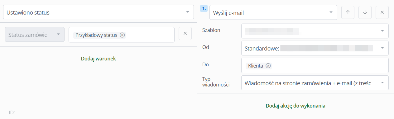 - wyślij e-mail – a następnie utworzyć drugą (osobną) akcję „Wyślij e-mail" (wraz z załączoną fakturą wygenerowaną w zewnętrznym systemie). Akcja ta powinna zostać wywołana zmianą statusu.