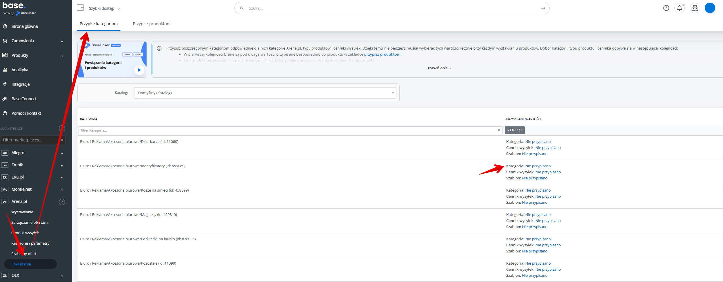 Wybierz kategorie Arena, w których chcesz wystawiać oferty w Dziale Arena.pl → Kategorie i parametry → Kategorie Arena.pl. Kategorie te będą wówczas dostępne na formularzu wystawiania oferty na liście rozwijanej w polu „Kategorie”. Jeżeli ten krok zostanie pominięty, to kategoria musi zostać przypisana na podstawie numeru ID. Możesz również ustawić domyślne kategorie Arena dla całego konta Arena, określonej kategorii z magazynu lub pojedynczego produktu.