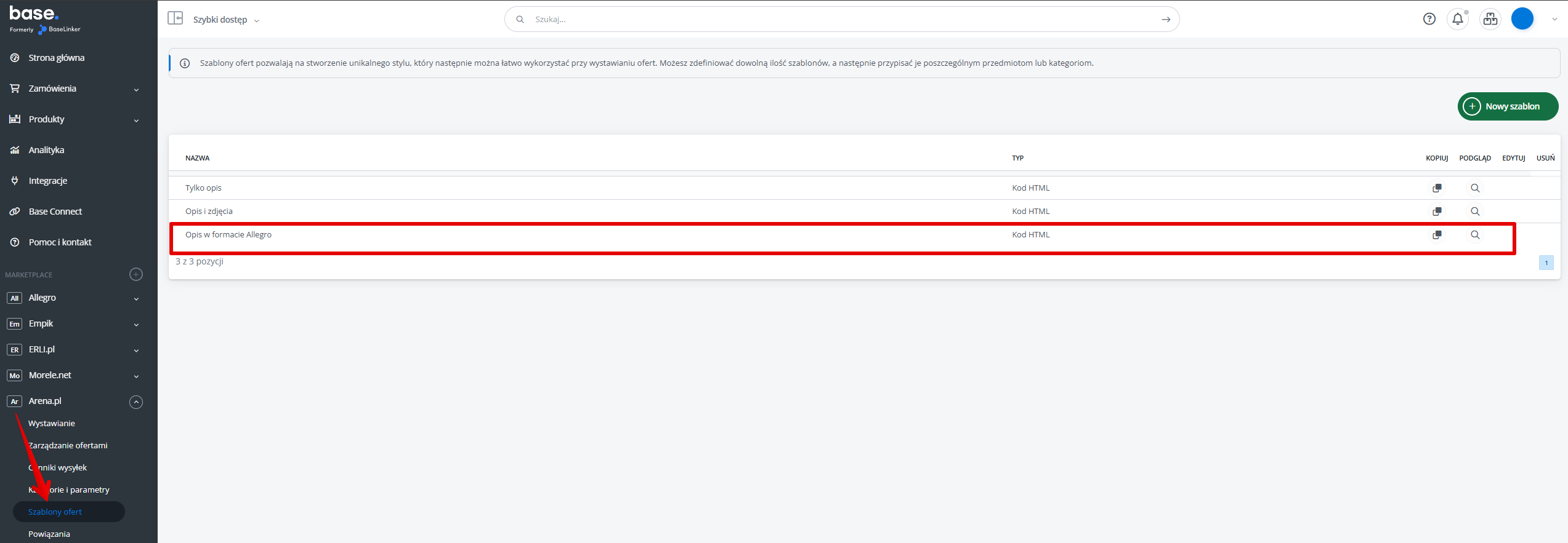 Podczas wystawiania nowej oferty w Base.com, będziesz mógł wybrać ten szablon ręcznie z listy. Ponadto system umożliwia ustawienie domyślnego szablonu — dla całego konta Arena, dla określonych kategorii z magazynu bądź dla określonych produktów.