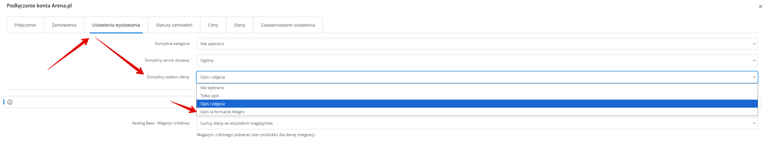 Jeżeli chcesz wystawiać na platformie Arena jedynie oferty z przypisanym szablonem "Opis w formacie Allegro", ustaw ten szablon jako domyślny dla całego konta. Można to zrobić w Dziale Integracje → Konta Arena.pl → Ustawienia → Ustawienia wystawiania → Domyślny szablon oferty → Opis w formacie Allegro.