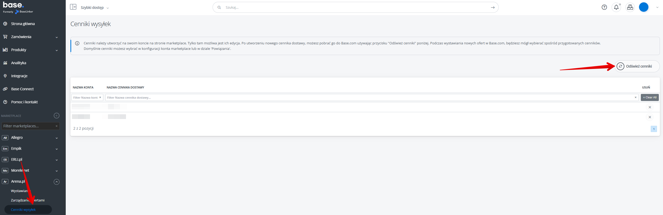 - Konto Arena zawiera przynajmniej jeden cennik, produkt lub zamówienie. W innym przypadku podłączenie jest niemożliwe, ponieważ API Areny nie zwraca żadnego komunikatu o ewentualnym błędzie połączenia. Z tego powodu system Base.com usiłuje pobrać jedną z wyżej wymienionych danych, w celu sprawdzenia poprawności podłączenia. Ich brak odbierany jest tak samo, jak błędnie podane dane. W takim wypadku należy dodać cennik na platformie Arena, a następnie podłączyć konto.