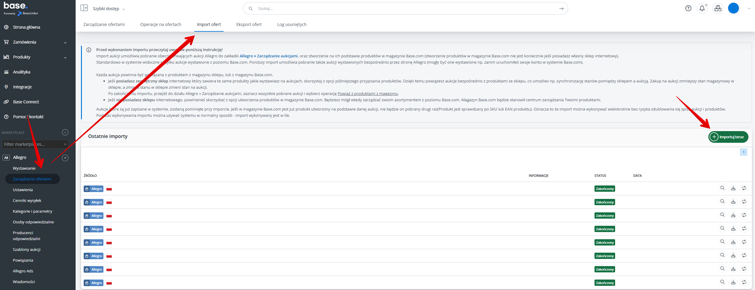 Po podłączeniu konta zaimportuj aukcje Allegro w Dziale Allegro → Zarządzanie aukcjami → Import aukcji do magazynu Base.com.
