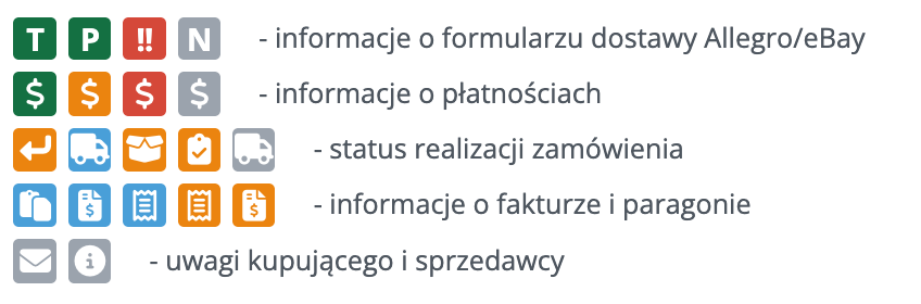 - ikonograficzne informacje o: formularzu dostawy, płatnościach, fakturze, nadaniu paczki, uwagach od klienta i sprzedawcy; po kliknięci na ikonę wyświetli się pełen opis; w dziale Zamówienia > Ustawienia > Lista zamówień możesz skonfigurować wielkość ikon, widocznych na liście zamówień.