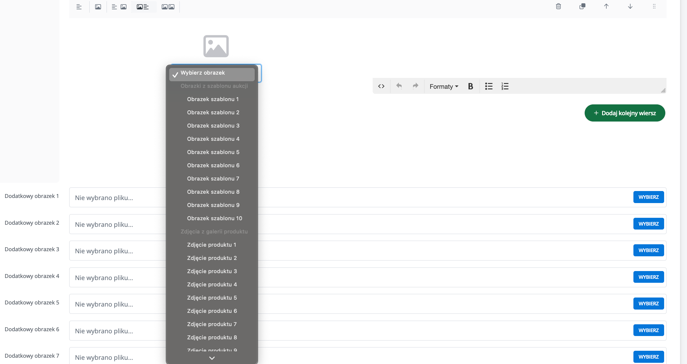 Do szablonu możesz wgrać do 10 dodatkowych zdjęć, które związane będą z tym szablonem. Może to być np. logo firmy lub inny stały element szablonu. Zdjęcia szablonu zostaną doklejone na koniec galerii aukcji.