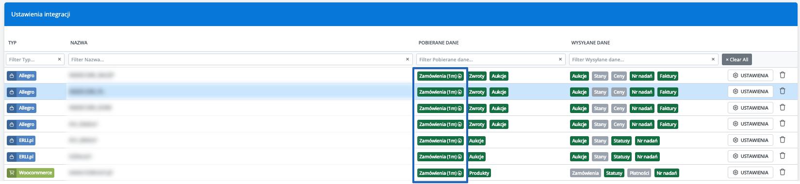 Zamówienia ze sklepu oraz pozostałych platform marketplace (podłączonych przez API) domyślnie pobierane są co 10 minut, jednak w dowolnym momencie możesz pobrać zamówienia ręcznie (dział Integracje → sekcja Ustawienia Integracji → kolumna Pobierane dane → przycisk Zamówienia).