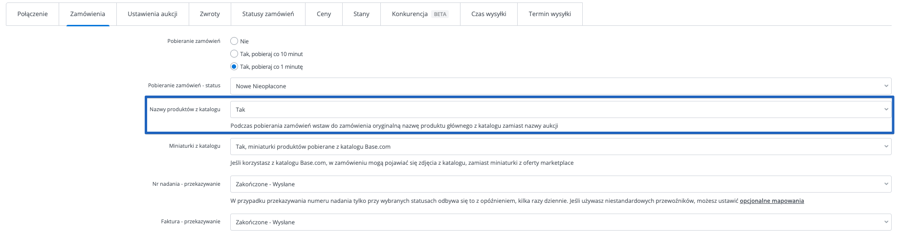 Nazwy produktów w zamówieniu domyślnie pobierane są z danej aukcji. Natomiast system umożliwia pobieranie nazwy również z magazynu Base.com, magazynu sklepu internetowego lub dowolnego magazynu podłączonego do Base.com.
