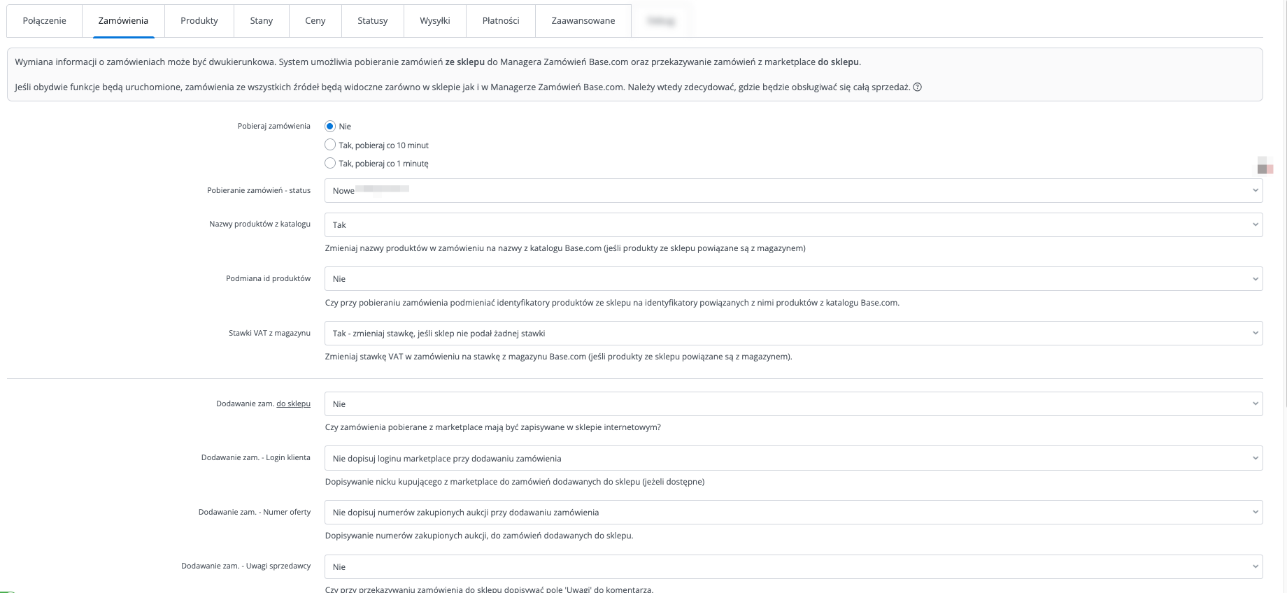 Pobieranie zamówień z danego konta marketplace możesz włączyć w ustawieniach konta danej integracji, w dziale Integracje → Konto marketplace →Ustawienia → Zamówienia → Pobieranie zamówień.