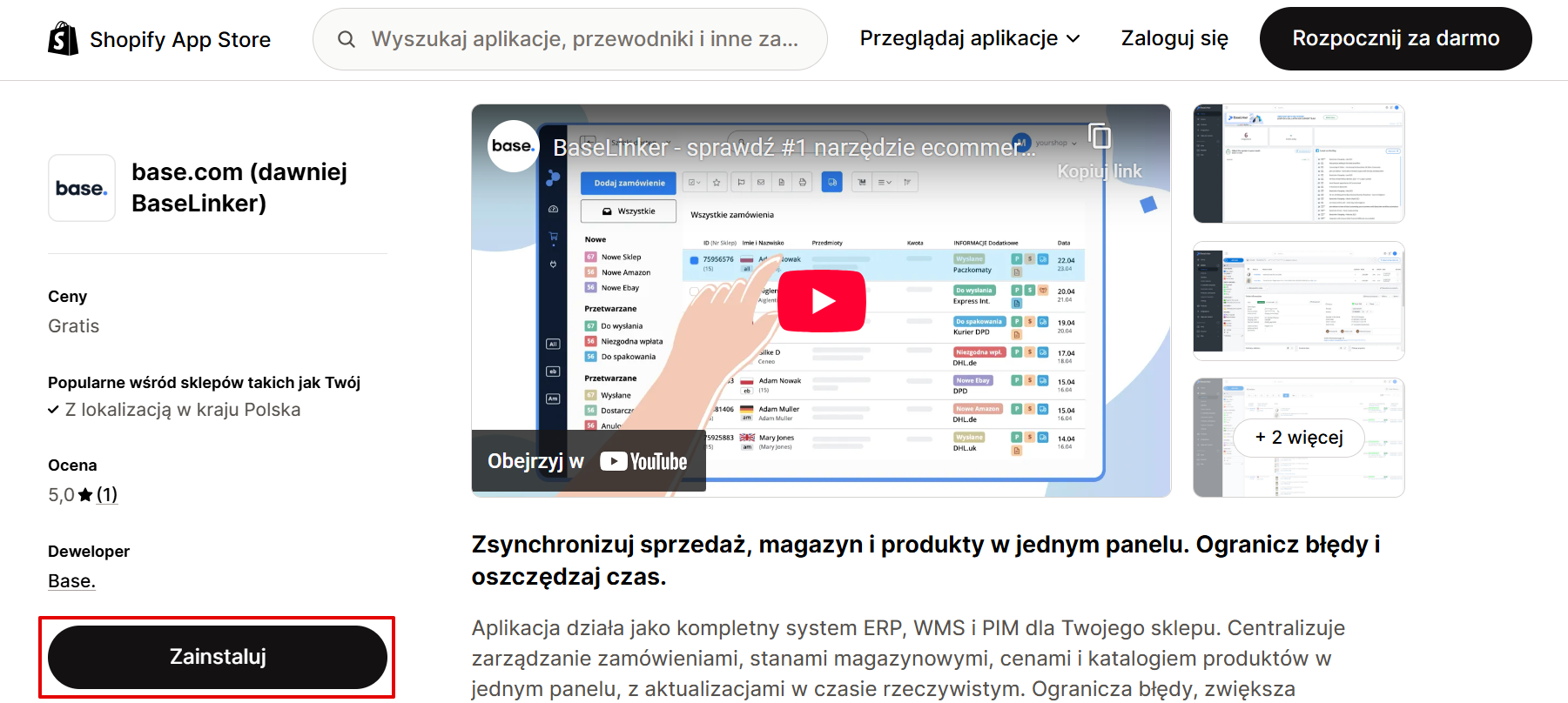 Po przekierowaniu do Shopify App Store, kliknij przycisk Zainstaluj przy aplikacji Base.com.