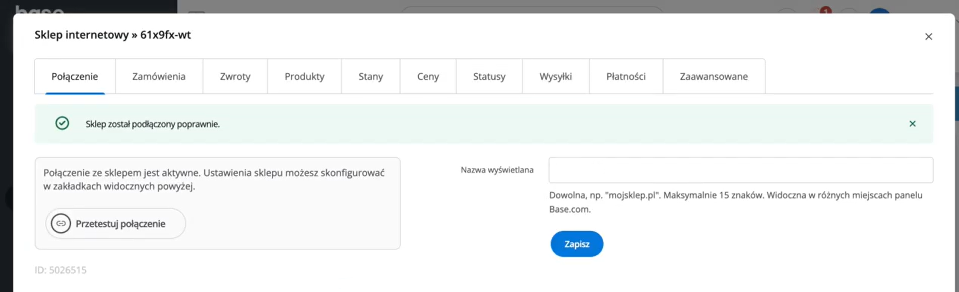 System automatycznie przekieruje Cię z powrotem do panelu Base z komunikatem o poprawnym podłączeniu sklepu.