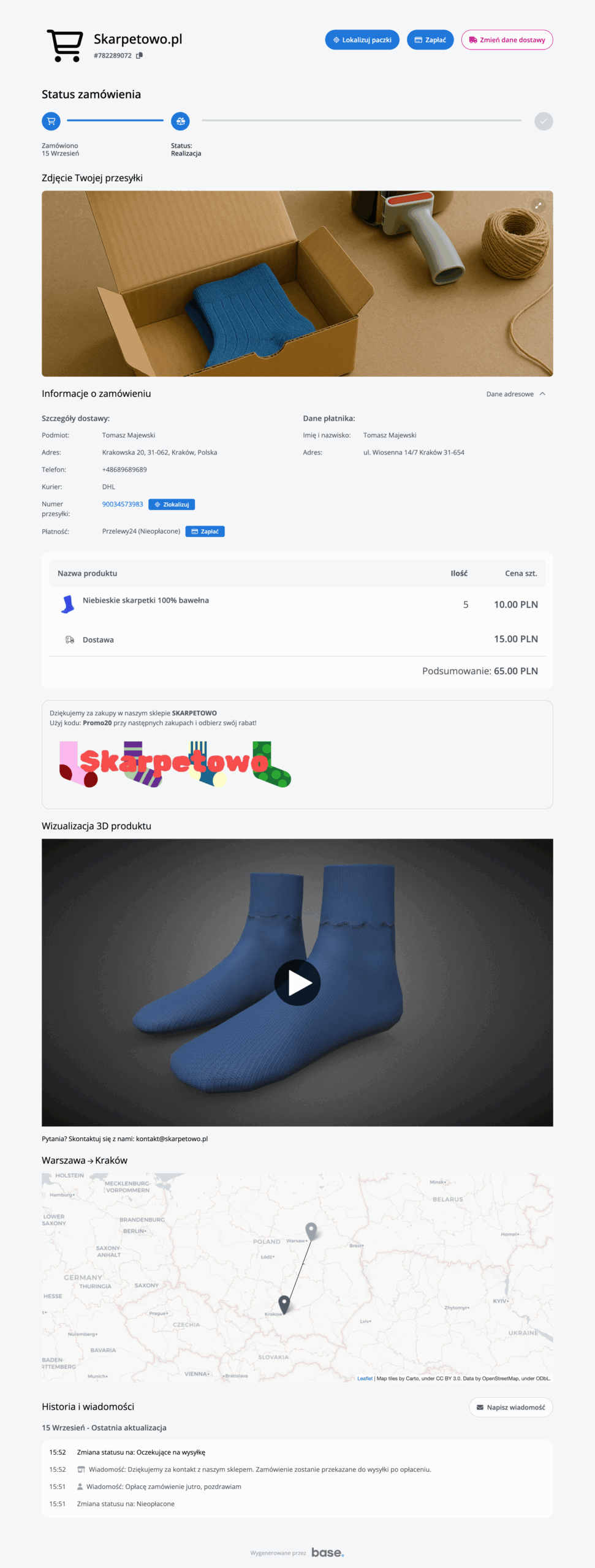 Strona informacyjna w nowej odsłonie to nie tylko podgląd statusu, ale pełnoprawny, nowoczesny panel obsługi zamówienia z elementami budującymi zaufanie i zwiększającymi szansę na kolejne zakupy. Oto jak wygląda przykładowy widok z perspektywy klienta.
