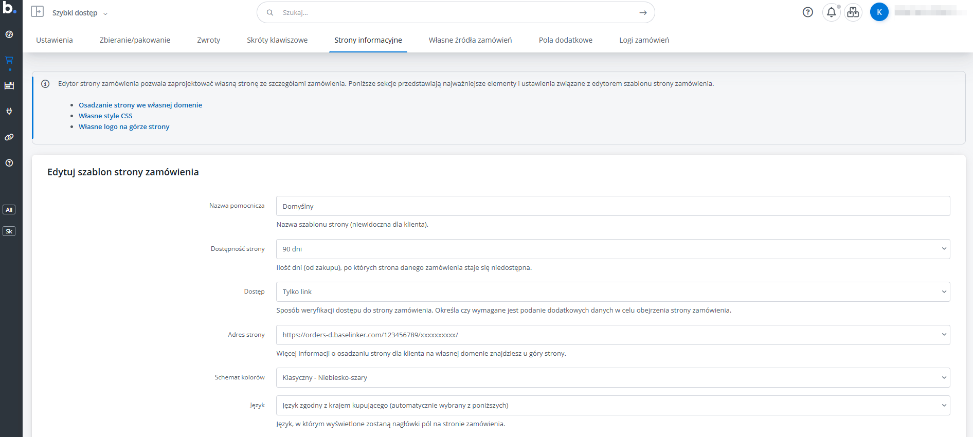 W oknie edycji strony informacyjnej w panelu, u góry strony znajdziesz przykładowy kod, który może zostać zastosowany do zmiany głównych kolorów na stronie zamówienia (koloru wodzącego oraz tła strony). Swój kod umieść w polu Własne style CSS w ustawieniach strony informacyjnej.