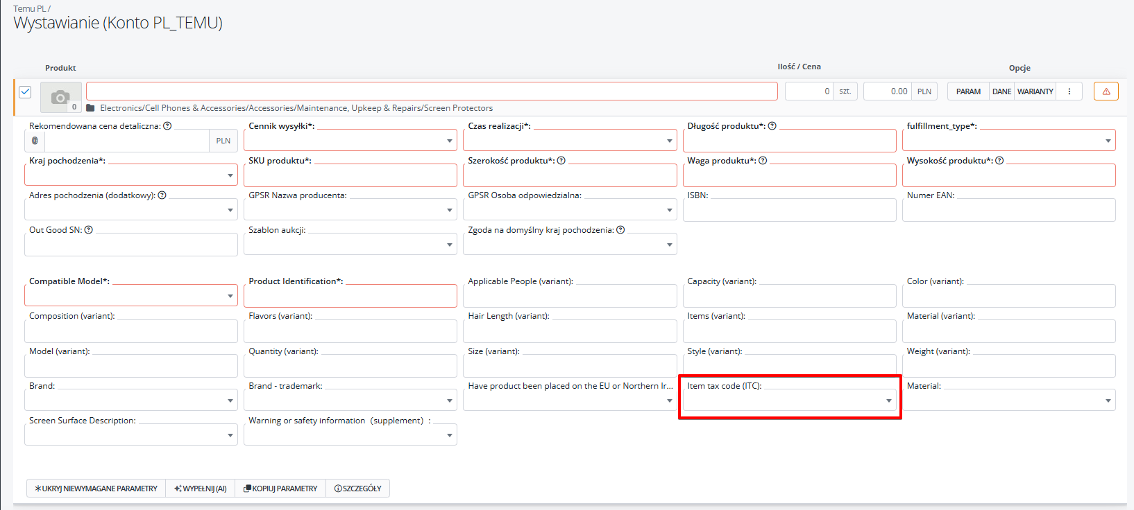 - Niektóre oferty na Temu powinny mieć uzupełnione minimum jedno pole wariantujące (oznaczone nazwą variant w nawiasie), które pojawia się po wybraniu kategorii i kliknięciu Wyświetl wszystkie parametry.