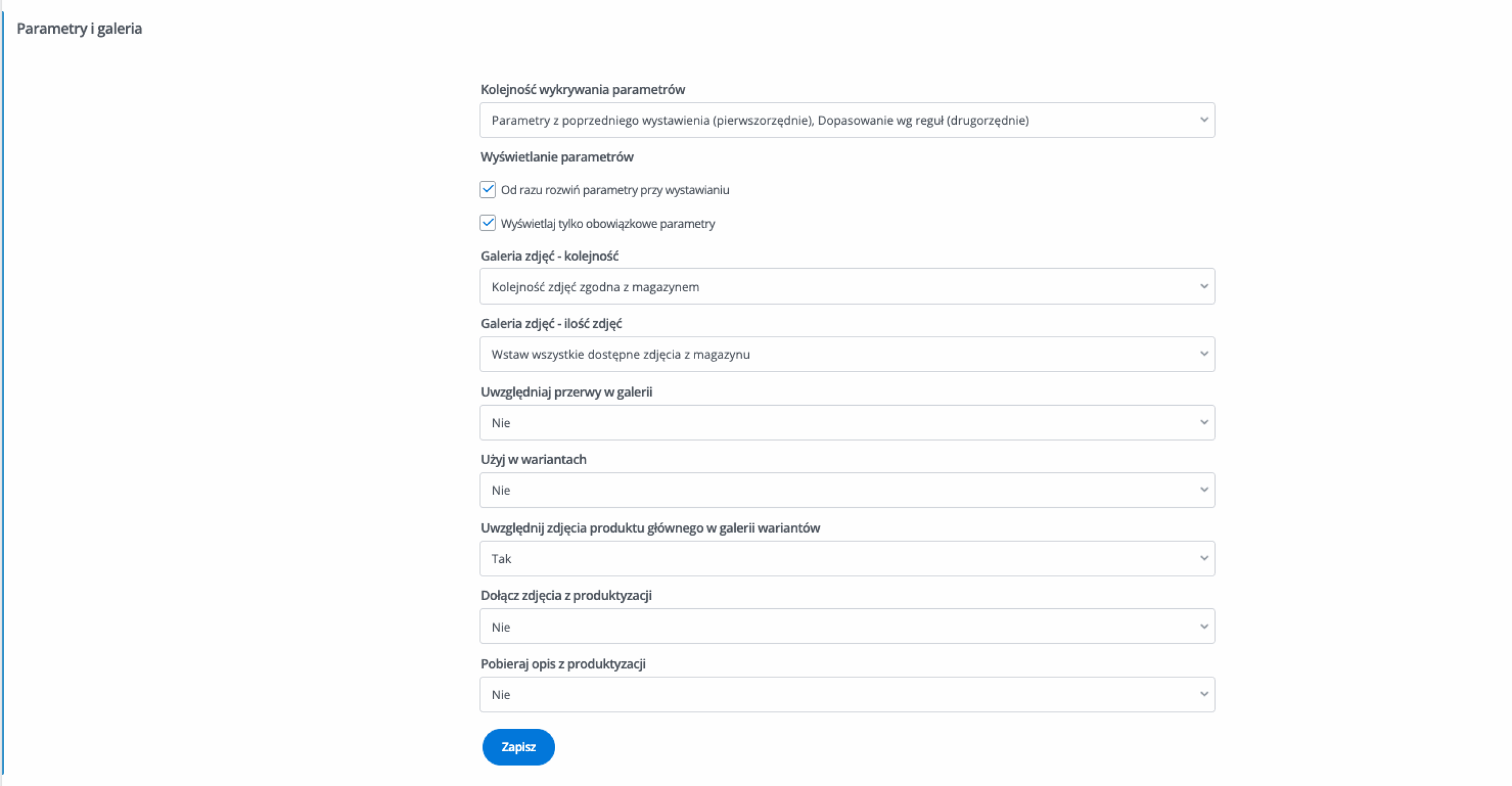 W dziale Marketplace → Ustawienia → Parametry i galeria określisz: