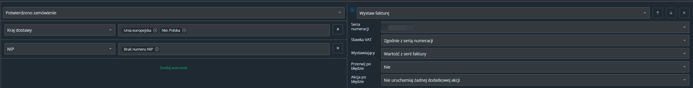 Podane zostały przykładowe warunki, w których dana akcja będzie się wyzwalała. Ważne jest, aby w akcji w polu Stawka VAT wybrać opcję Zgodnie z serią numeracji, gdyż akcja automatyczna ma nadrzędne ustawienia względem serii numeracji.