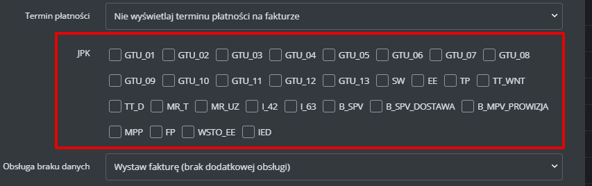 Ustawienia serii numeracji faktur pozwalają również wybrać odpowiednie oznaczenia umieszczane w pliku JPK.