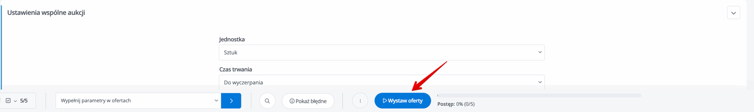Jeżeli uprzednio odpowiednio skonfigurowałeś cały moduł i wszystkie potrzebne parametry i dane zostały uzupełnione, to aby wystawić oferty kliknij niebieski przycisk Wystaw aukcje/oferty na dole strony.