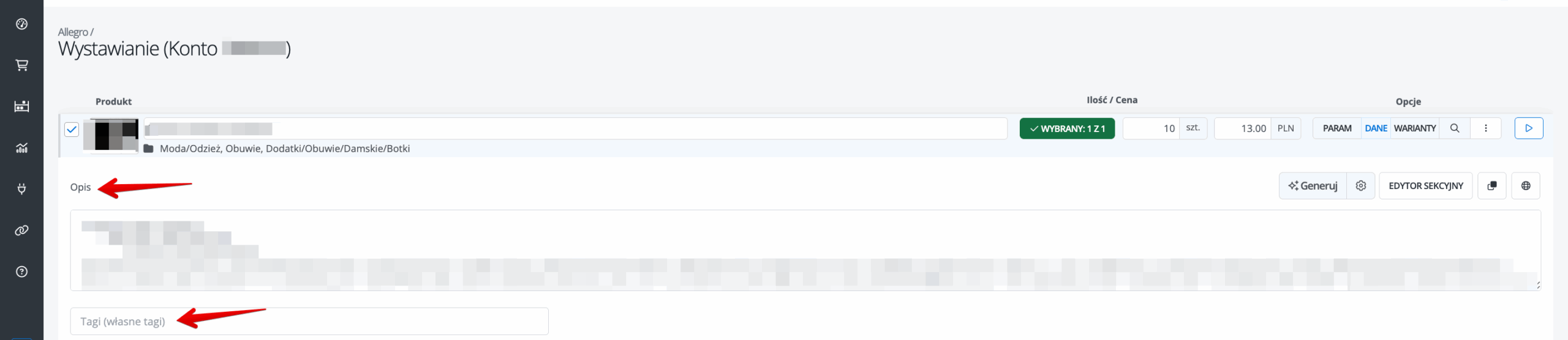 - Konto – konto marketplace, na którym chcesz wystawić swoje oferty (pole to pojawi się tylko wtedy, gdy podłączysz do systemu więcej niż jedno konto danego marketplace);