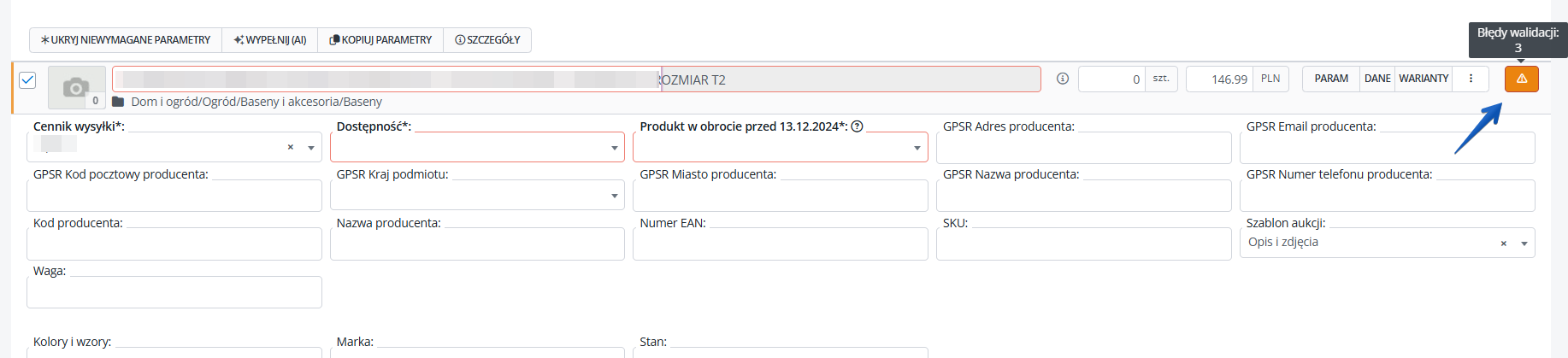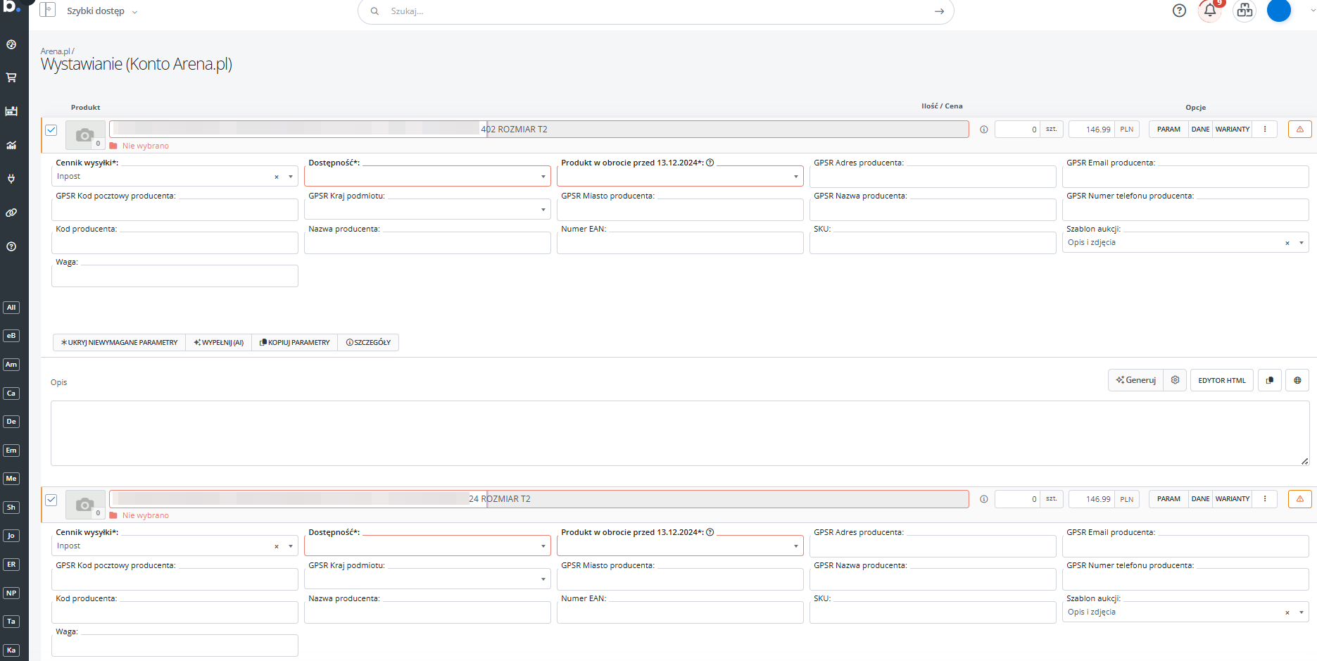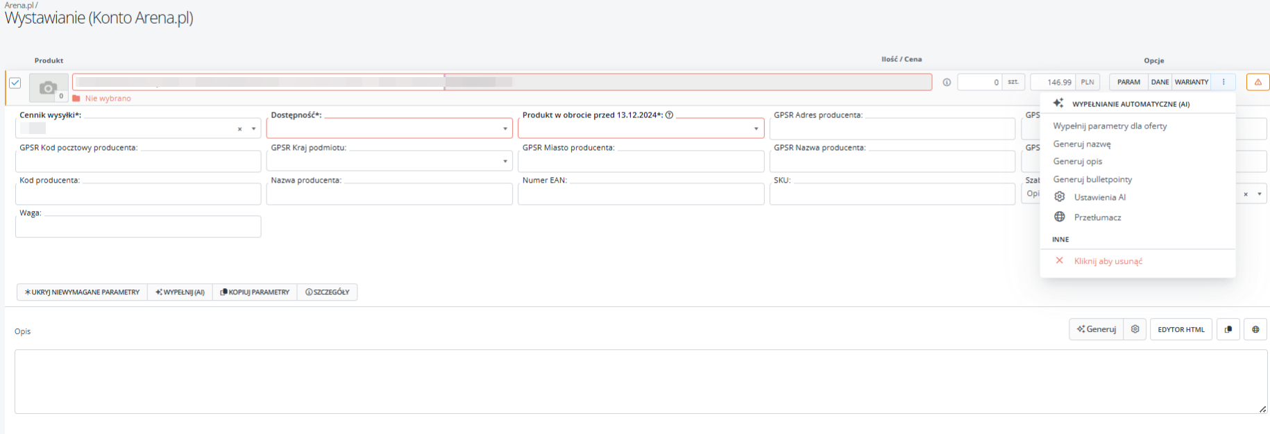 Pod przyciskiem „Param” znajdują się informacje o parametrach wystawianego produktu: SKU produktu, Numer EAN, Waga, Nazwa producenta, Kod producenta i Dostępność, GPSR, Cennik wysyłki, Szablon aukcji. Kolejne wyświetlone parametry związane są z kategorią, do jakiej produkt jest przypisany. Pola pogrubione i oznaczone gwiazdką są obowiązkowe. Istnieje możliwość wykrycia bądź skopiowania parametrów.