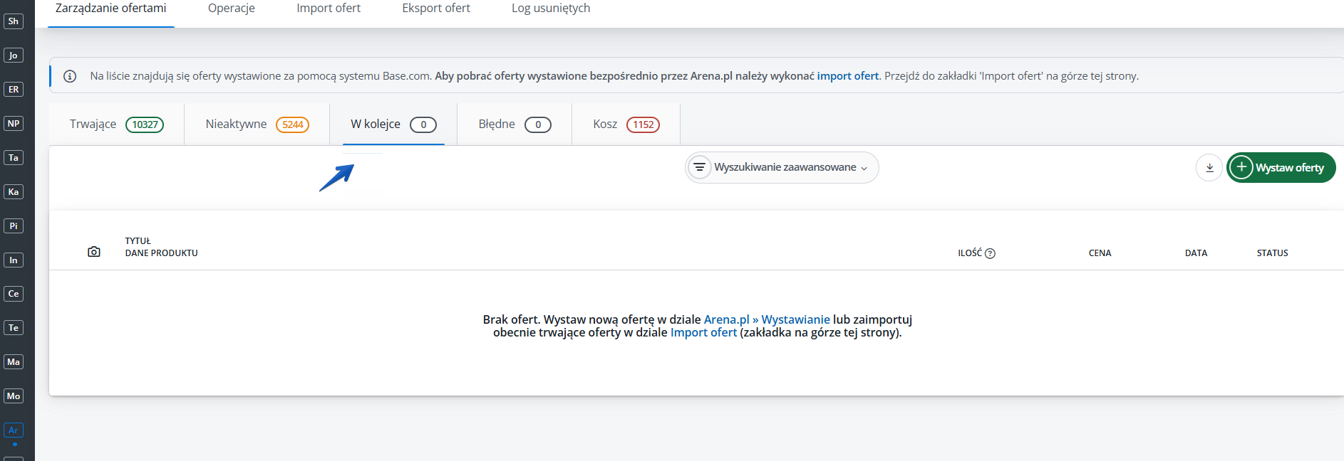 - W kolejce — oferty w trakcie wystawiania na platformie Arena.pl. Po wybraniu niebieskiego przycisku „Wystaw oferty” na formularzu wystawiania, oferty trafiają do zakładki "W kolejce". Są to oferty wstępnie zwalidowane przez system Base.com i przesyłane na platformę Arena.pl.
