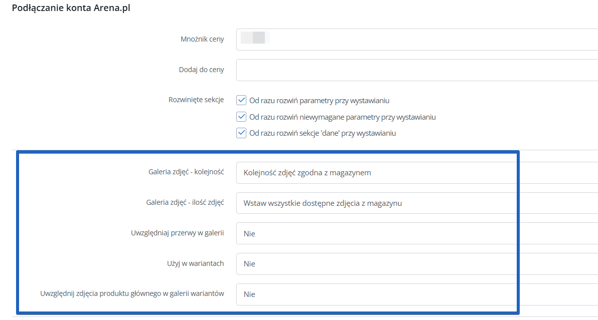 W dziale Integracje → Konta Arena → Ustawienia → Ustawienia wystawiania istnieje możliwość konfiguracji, ile zdjęć zostanie wyświetlonych i w jakiej kolejności.