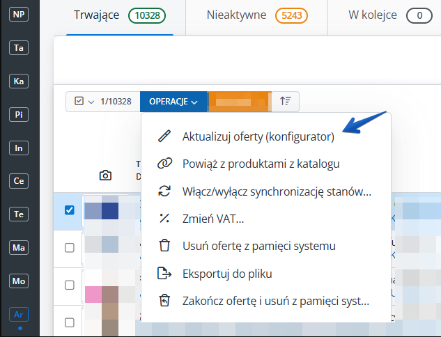 Niebieski przycisk "Operacje" pozwala hurtowo wykonać pewne operacje na więcej niż jednej ofercie jednocześnie.