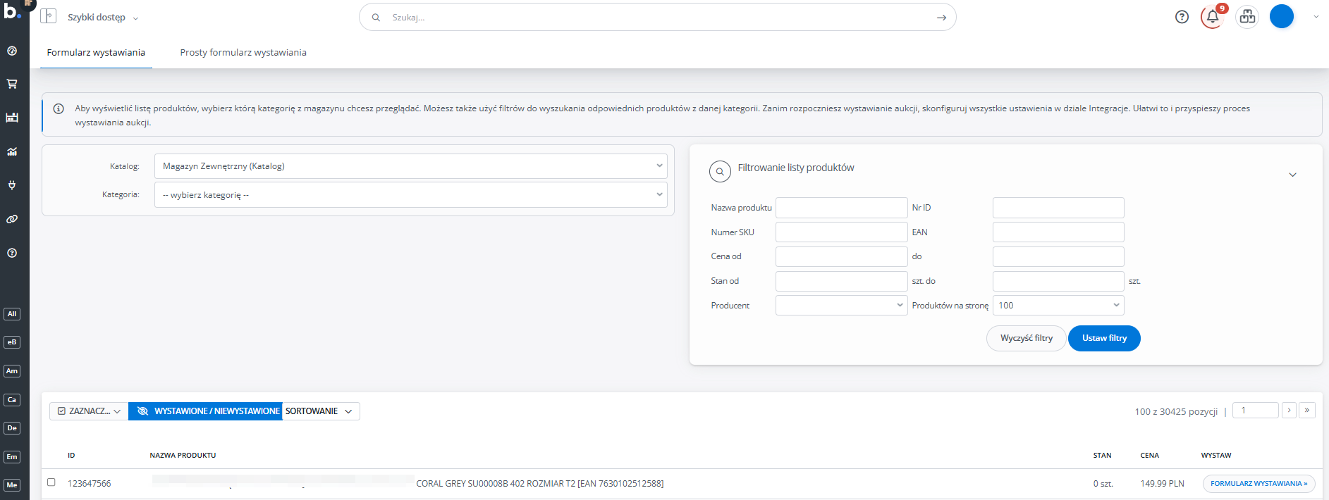 Każdy produkt możesz wystawić pojedynczo, klikając w "Formularz wystawiania". Możesz też wystawić jednocześnie więcej produktów. Po wybraniu właściwych produktów wystarczy wybrać niebieski przycisk „Wystaw zaznaczone (formularz)”, aby przejść do formularza wystawiania oferty.