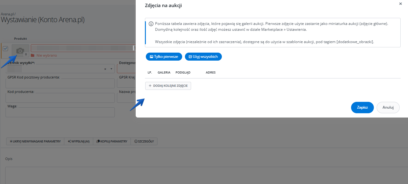 Przy tytule oferty znajduje się sekcja ze zdjęciami. W tym miejscu można dodać zdjęcie, które pojawi się w galerii oferty. Ilość oraz kolejność wyświetlanych zdjęć można zmienić w Dziale Arena.pl → Konta Arena.pl → Ustawienia → Ustawienia wystawiania → Pole Galeria zdjęć – kolejność / Galeria zdjęć – ilość zdjęć.