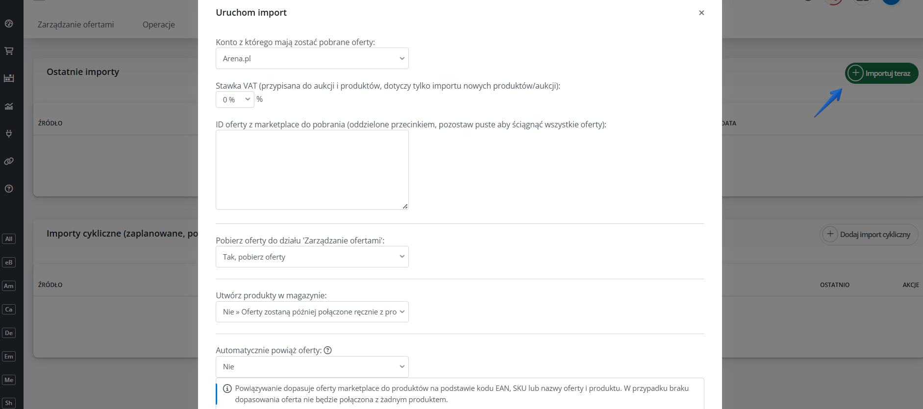 Domyślnie w systemie widoczne są tylko oferty wystawione z poziomu Base.com. Import ofert w Dziale Arena.pl → Zarządzanie ofertami → Import ofert umożliwia pobranie także ofert wystawionych bezpośrednio na platformie Arena.pl, jeszcze przed włączeniem modułu i podłączeniem konta Arena w systemie Base.com.