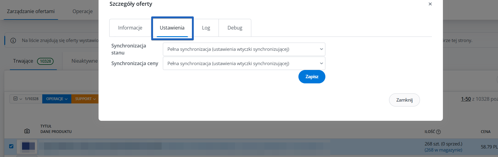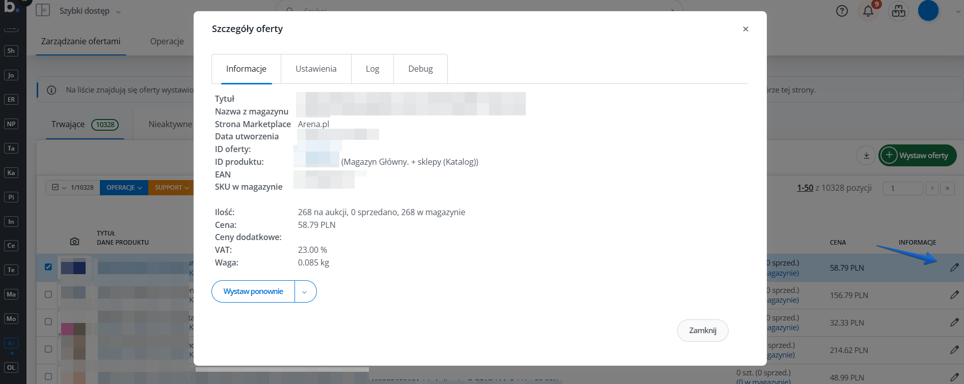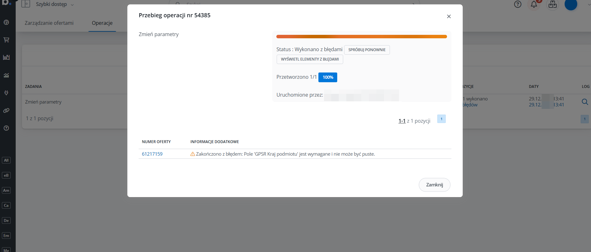 W tej zakładce można sprawdzić log ostatnio wykonywanych operacji na ofertach, np. zmianę parametrów, oraz zobaczyć komunikat w przypadku niepowodzenia operacji.