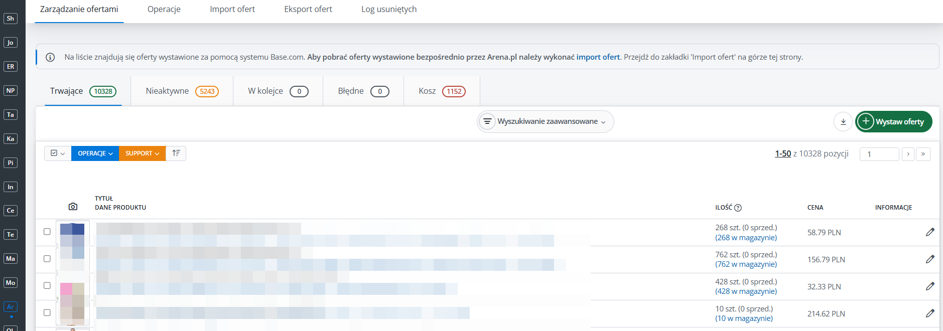 Jeżeli oferta została poprawnie wystawiona na platformie Arena.pl, wówczas wpada do zakładki "Trwające", a po jej zakończeniu do zakładki "Nieaktywne". Oferty zarządzane z poziomu systemu Base.com będą automatycznie przenoszone pomiędzy zakładkami. Natomiast jeżeli status lub stan zmieniony został w Arenie, nie będzie widoczny w Base.com.